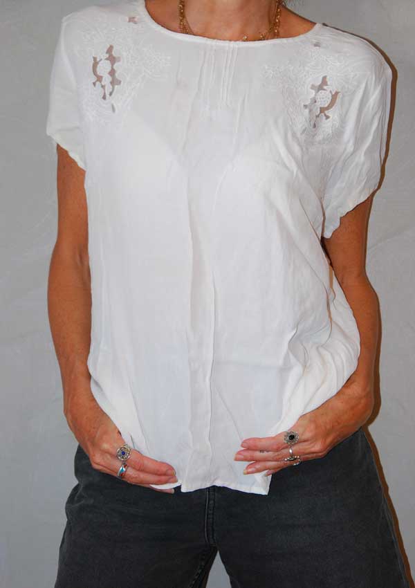 חולצה לבנה עם פרחים רקומים בצד וכפתורים בגב