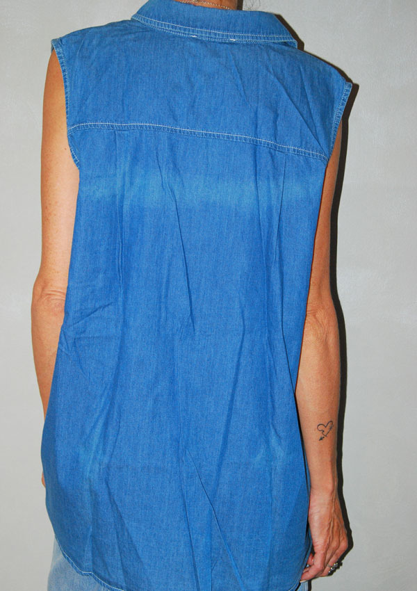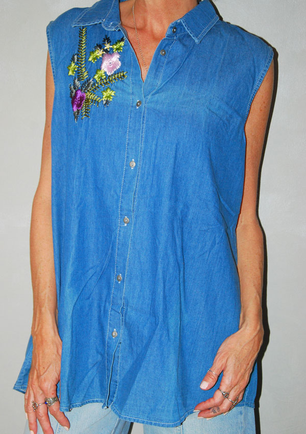חולצת ג'ינס מכופתרת עם פרחים רקומים החלק העליון בגב יש פס של דהיית צבע שמורגש הרבה יותר בתמונה מאשר במציאות