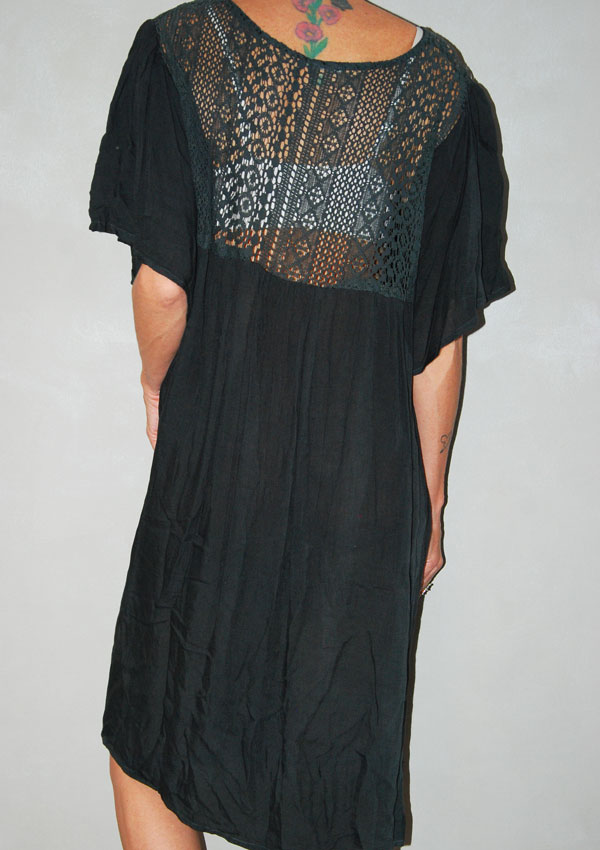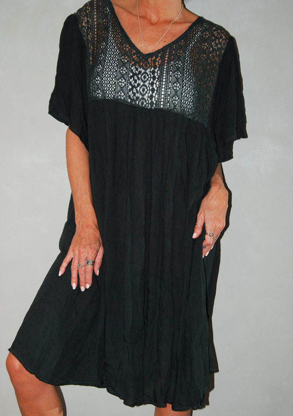 שמלה כותנתית שחורה נושמת וחמודה, חלק עליון קרושט, הדוגמנית לובשת גוזייה לבנה