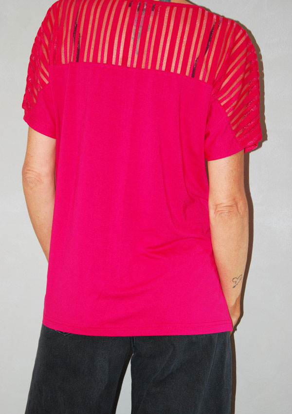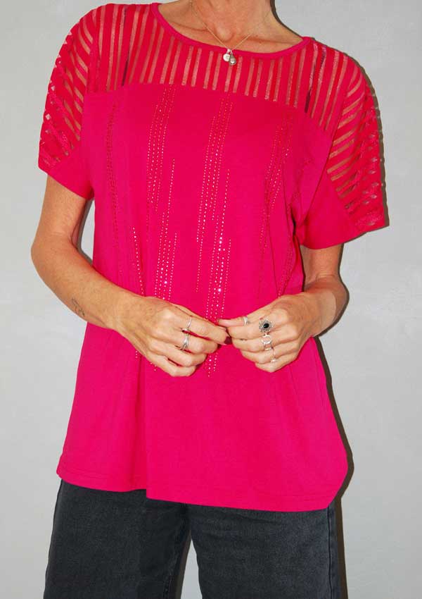 חולצה ורודה עם אבנים ורודים לאורך החולצה מידה 5