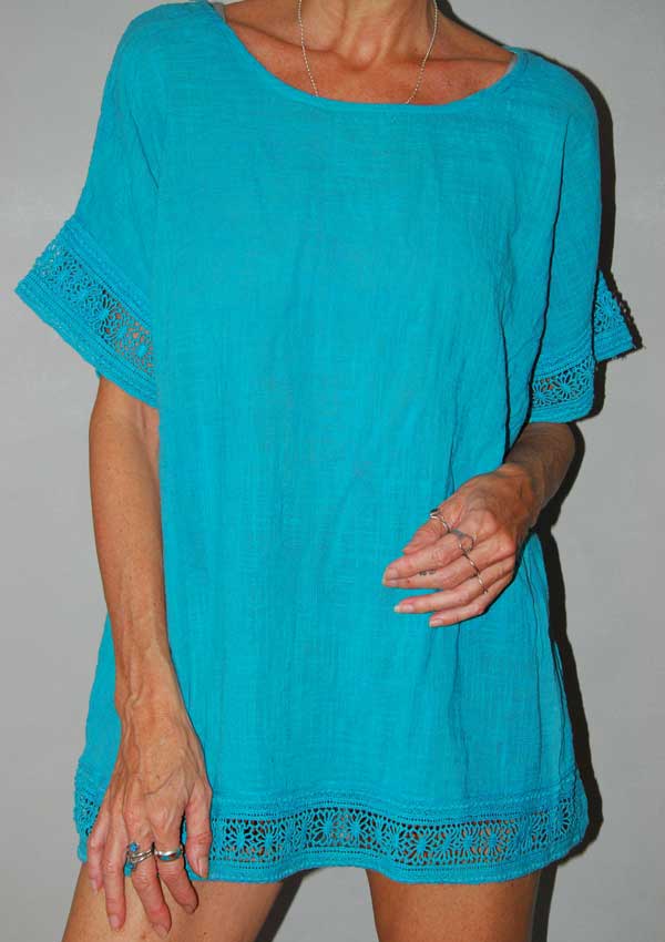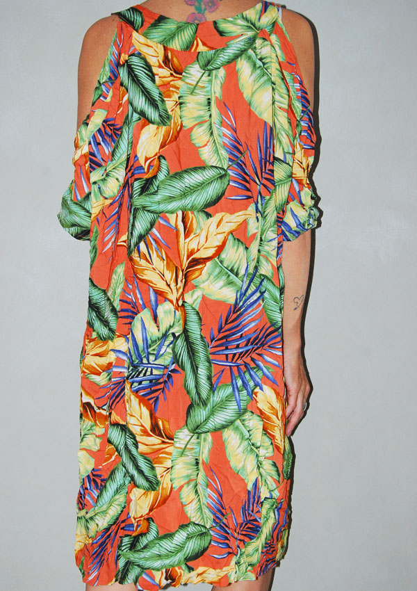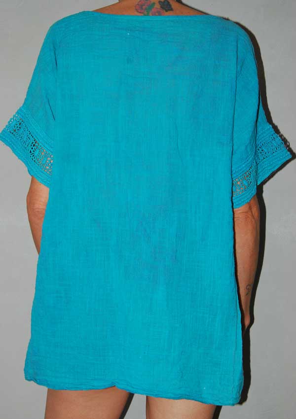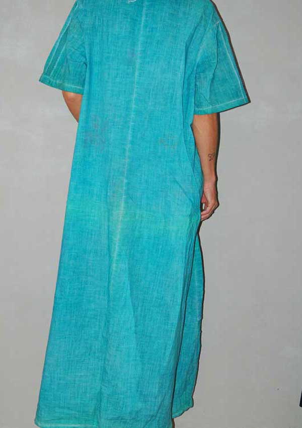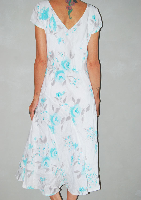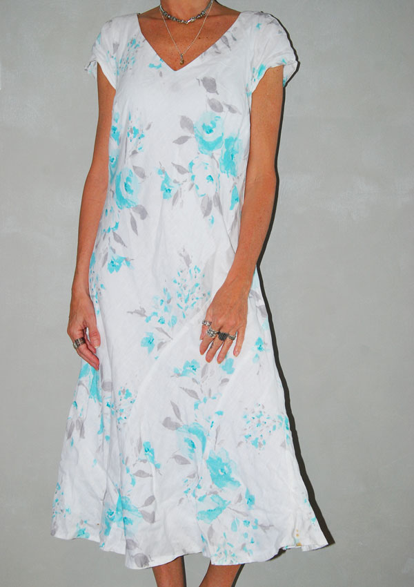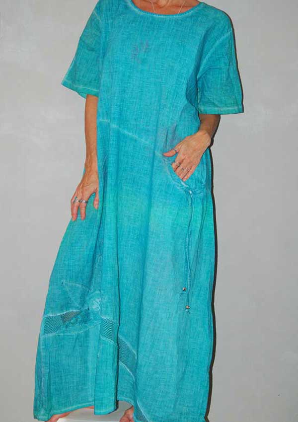 שמלת טורקיז מעורבב עם כתמי ורוד עדינים מפשתן עם כיס מקדימה בחלק התחתון מאחר שהבד עשוי פשתן, ייתכנו הבדלי גוון טבעיים בין חלקי הבד
