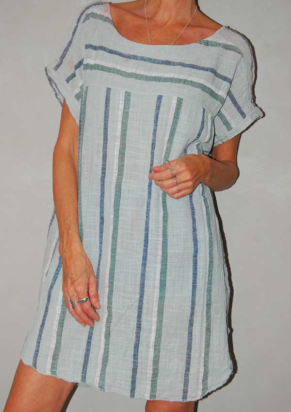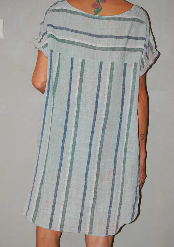 שמלת פסים מפשתן בצבעי טורקיז בהיר, ירוק, ג'ינס, לבן וטאי דאי מאוד עדין אדום