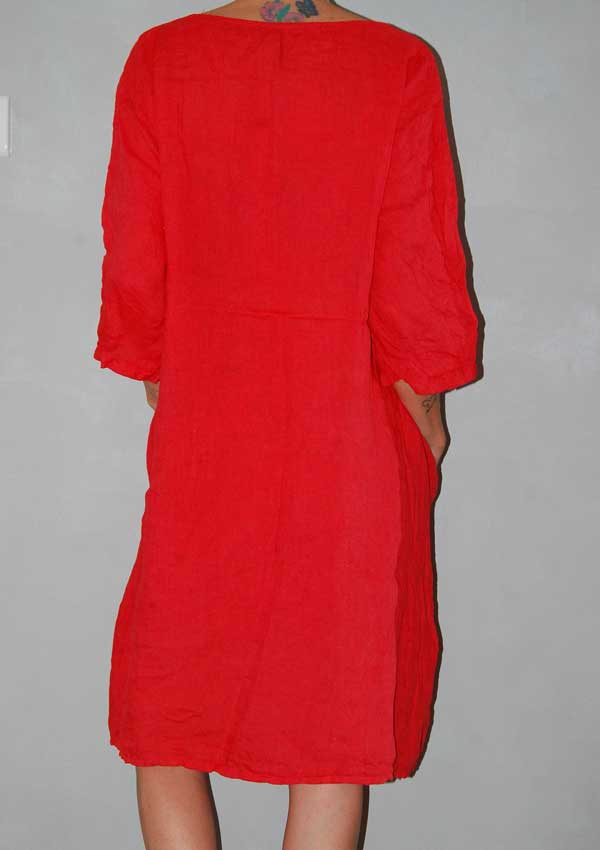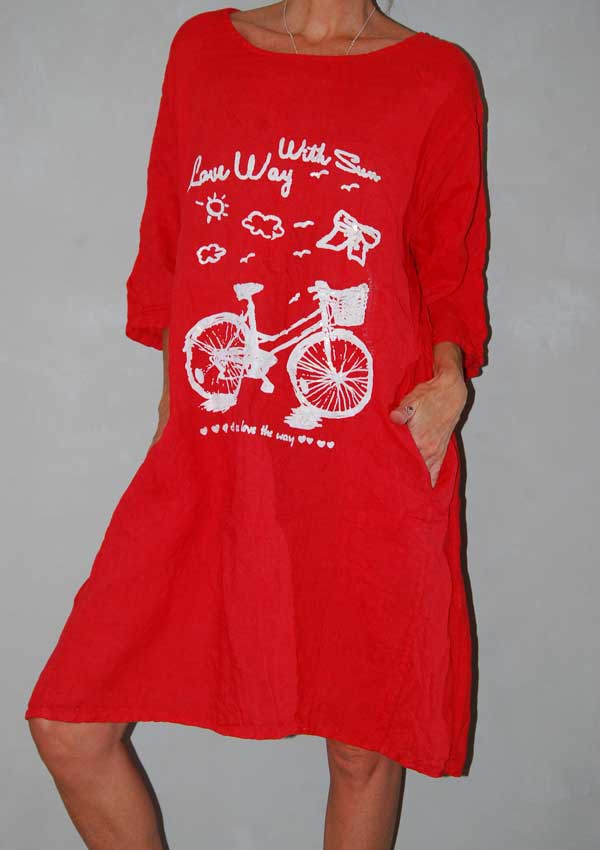 שמלה אדומה מפשתן MADE IN ITALY עם כיתוב של קיץ וכיסים בצד