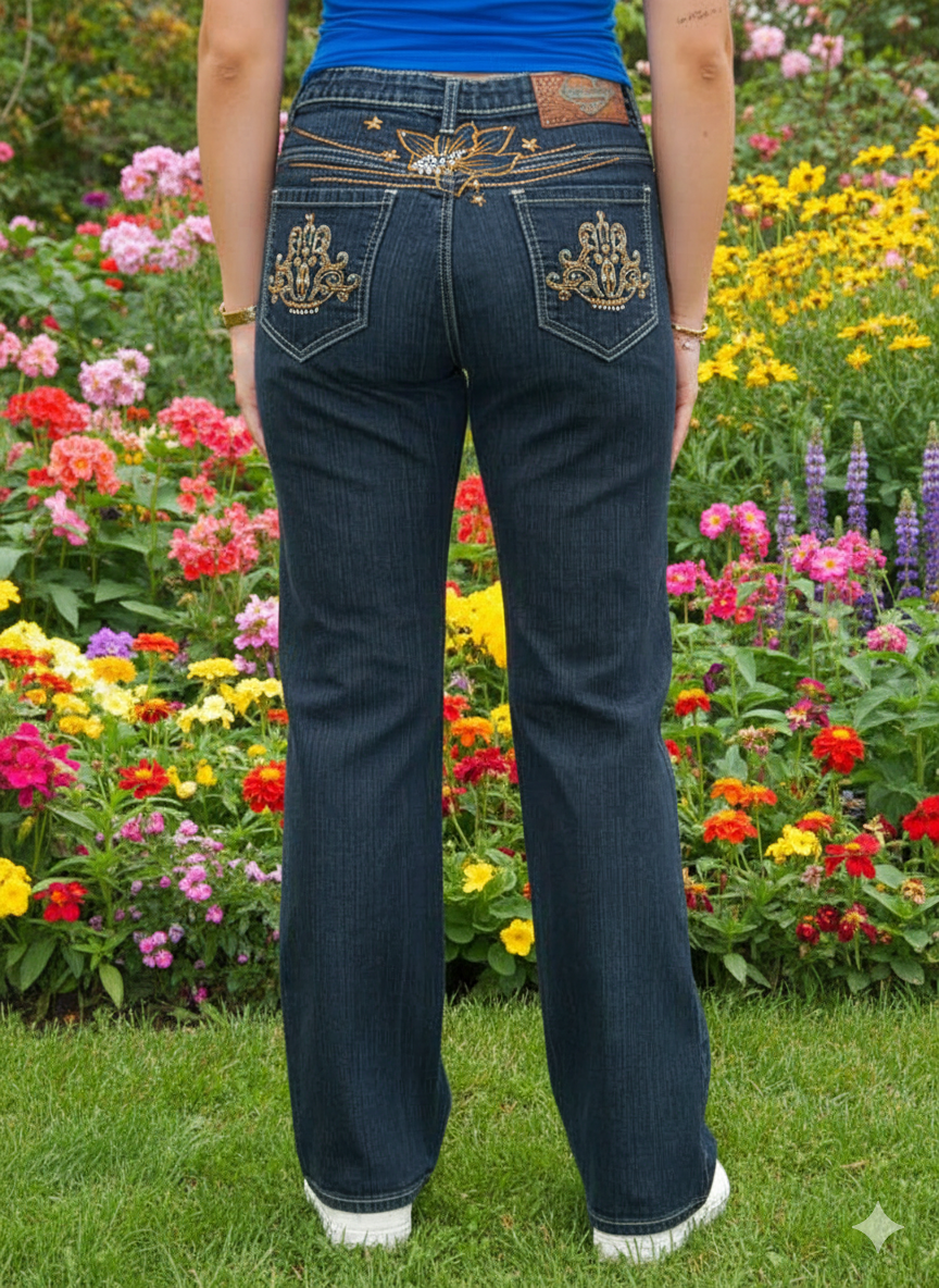 ג'ינס משנות ה-90 גזרת אמצע רחבות עם נצנצים וצורות רקומות בכיסים