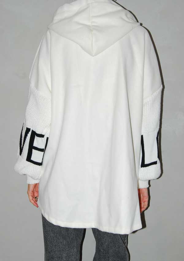 ז'קט מעילון בצבע לבן עם כיסים מקדימה שרוולים עשויים מסריג שרשום עליהם LOVE קפוצ'ון וריץ' רץ' לסגירה