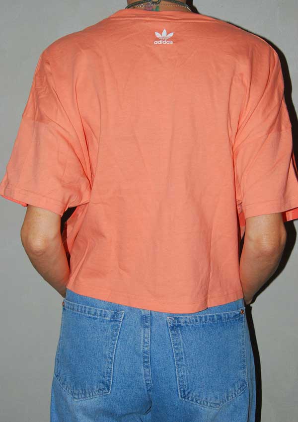 חולצת ADIDAS כתומה עם הדפס של הלוגו על החולצה, ההדפס קצת סדוק אבל בשלמותו