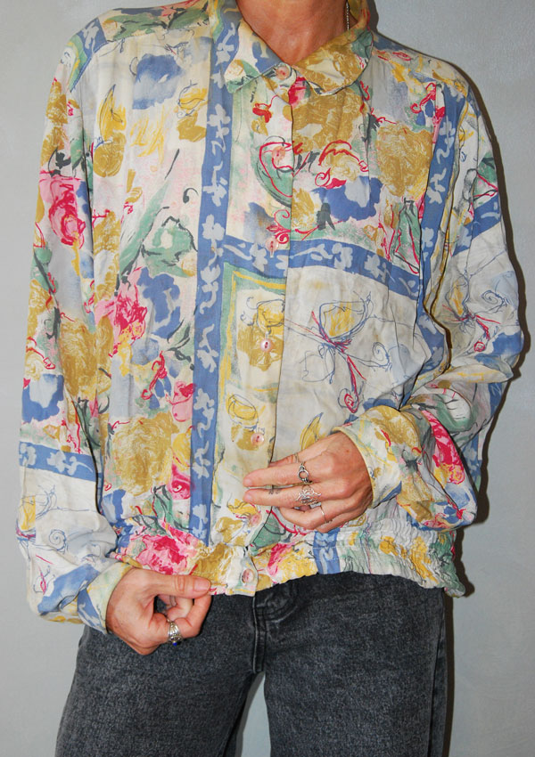 חולצת וינטג' משנות ה-80, עם צבעים צורות ופרחים, כפתורים לסגירה