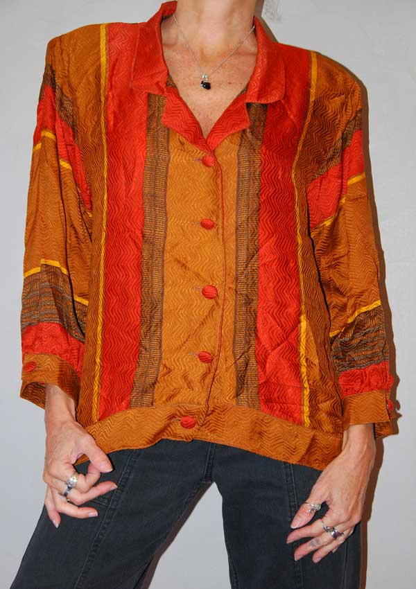 חולצת וינטג' מכופתרת משנות ה-70, צבעי אש – חמרה, בורדו כתום חום כריות בכתפיים שניתנות להורדה