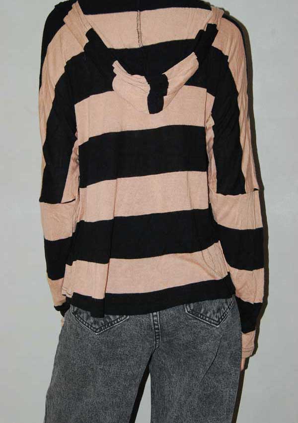 חולצת פסים כמו סריג דק דק בצבעי חום-שחור עם קפוצ'ון חלק אחורי יותר ארוך
