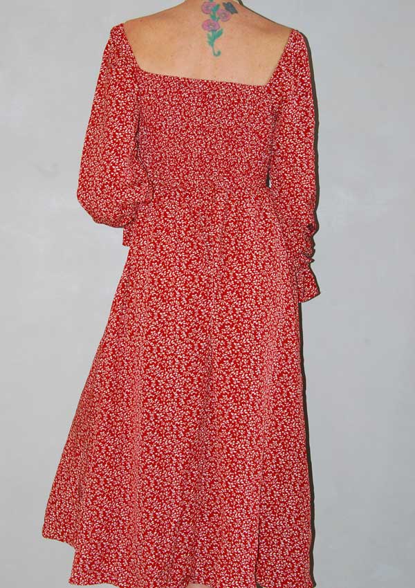 שמלת מקסי בצבע חמרה עם עלים ופרחים לבנים גומי בחזה