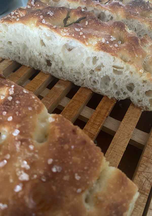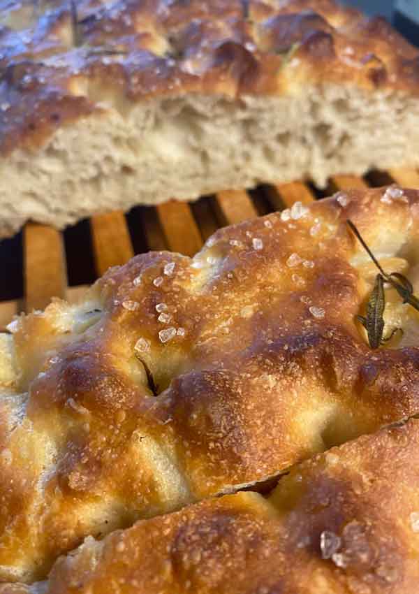 פוקצ'ה גדולה עבה והכי רכה וטעימה בעולם, עם שמן זית רוזמרין ומלח גס. מגיע בתבנית עוגה מרובעת גדולה