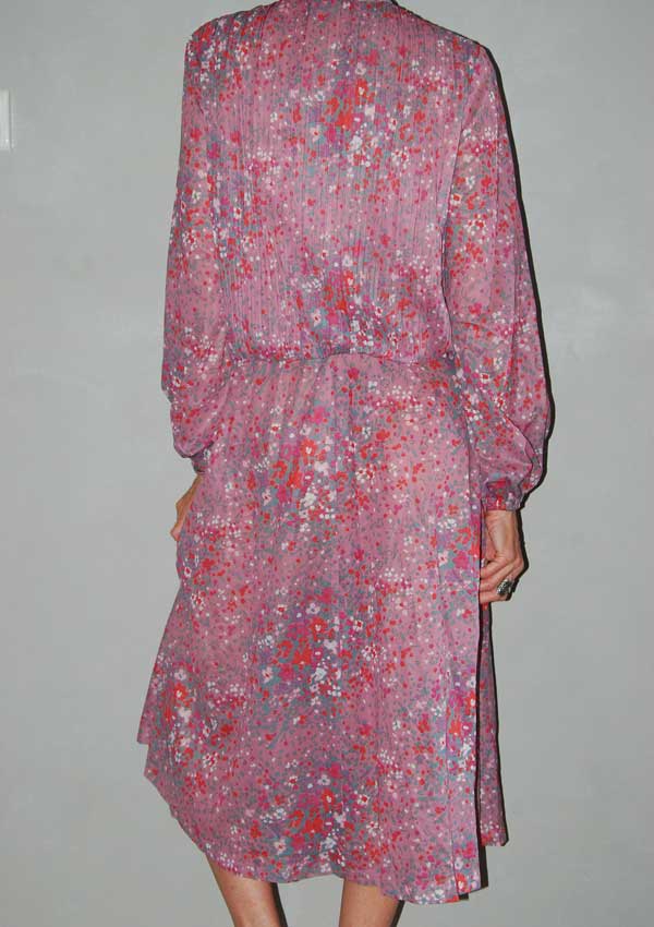 שמלת וינטג' משנות ה-80 בצבע ורוד עתיק עם נקודות ופרחים קטנים, גומי במותן עליונית פליסה וקשירה בצוואר