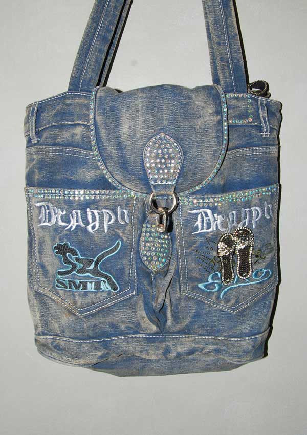 תיק ג'ינס מיוחד שנראה ממש כמו ג'ינס כם כתוביות רקומות, נצנצים ונעלים קטנות